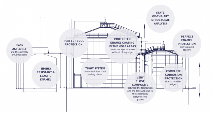 Enamelled steel tank, also known as Glass-Fused-to-Steel tank (GFS tank) and Glass-lined steel tank (GLS tank), contains the impermeable layers thanks to enamel protection coating. They are produced by firing at above 800°C, making the molten glass to react with the surface of the steel plate.