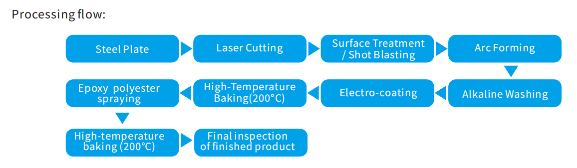 - Rolling / Arc Forming – Forming the steel plate into a cylindrical or curved shape.
